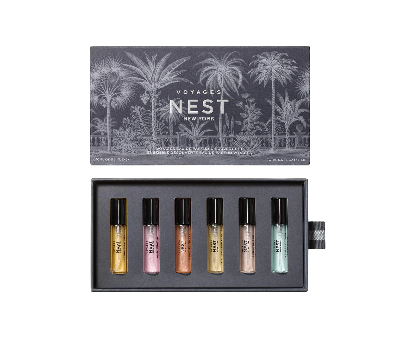Descubre la colección VOYAGES de NEST New York con el Discovery Set Eau de Parfum, un exclusivo set que incluye 6 fragancias icónicas en formato de 3 ml cada una. Perfecto para quienes desean explorar aromas sofisticados y llevar el lujo a cualquier lugar.