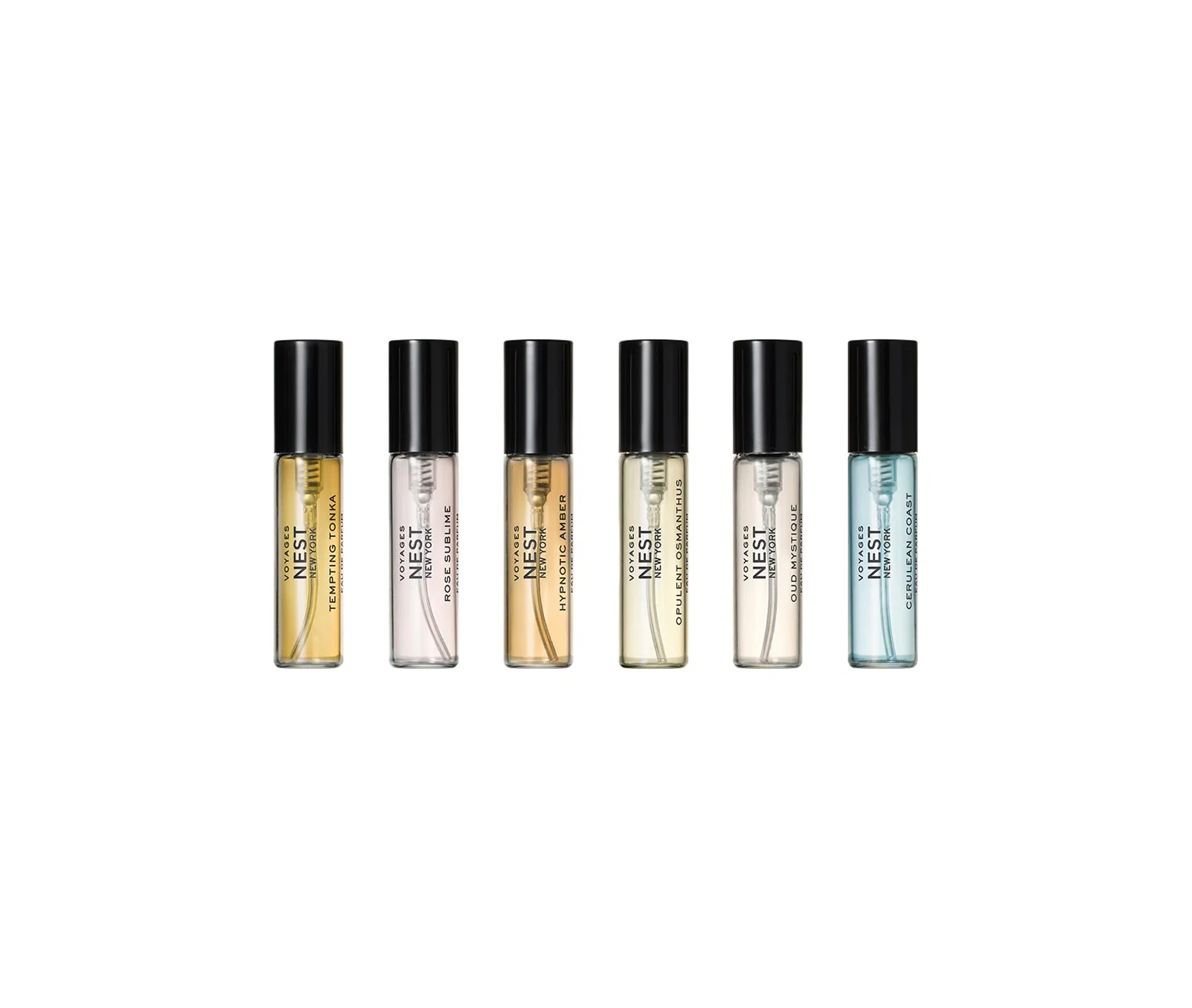 Explora 6 fragancias icónicas en formato de 3 ml cada una. Incluye Rose Sublime, Cerulean Coast, Tempting Tonka, Hypnotic Amber, Opulent Osmanthus y Oud Mystique.