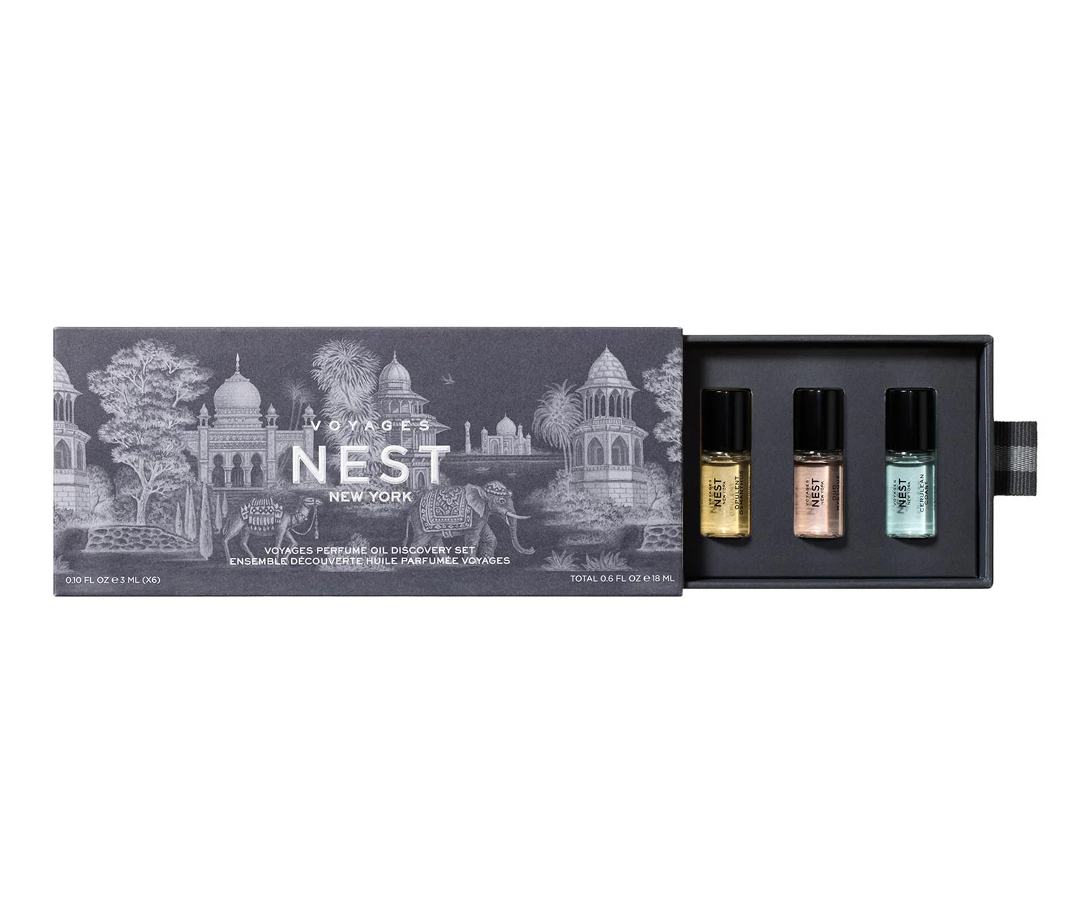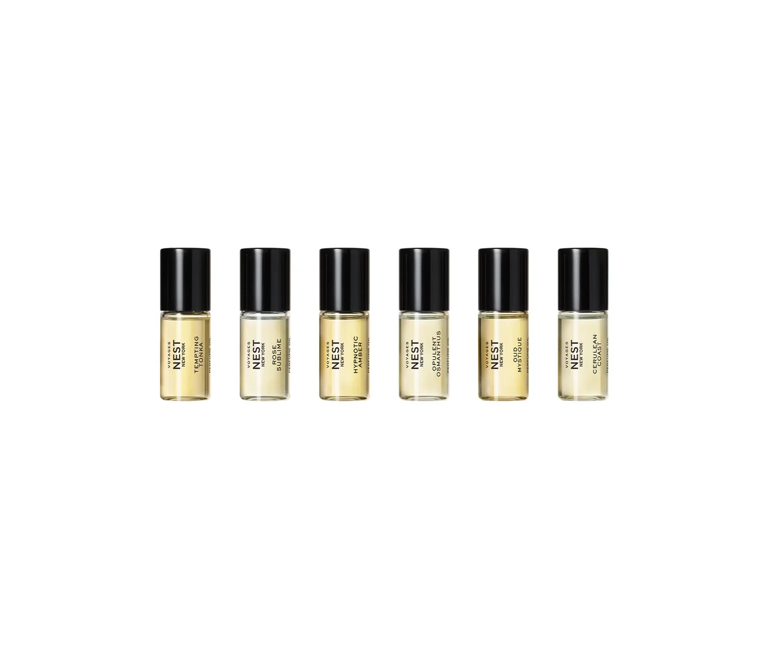 Descubre la colección VOYAGES de NEST New York con el Perfume Oil Discovery Set, un exclusivo set que incluye 6 fragancias icónicas en formato aceite de perfume de 3 ml cada una. Perfecto para quienes desean explorar aromas sofisticados y disfrutar de una aplicación más duradera y envolvente.